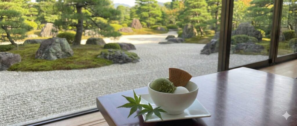 足立美術館内にある喫茶室「翆(みどり)」は、何と言ってもその窓から広がる枯山水庭の絶景が最大の特徴です。