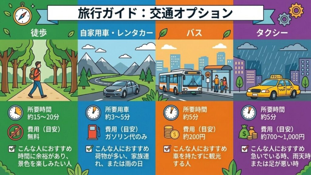 | 車・レンタカー | 約3〜5分 | ガソリン代のみ | 荷物が多い・家族連れ・雨天 |