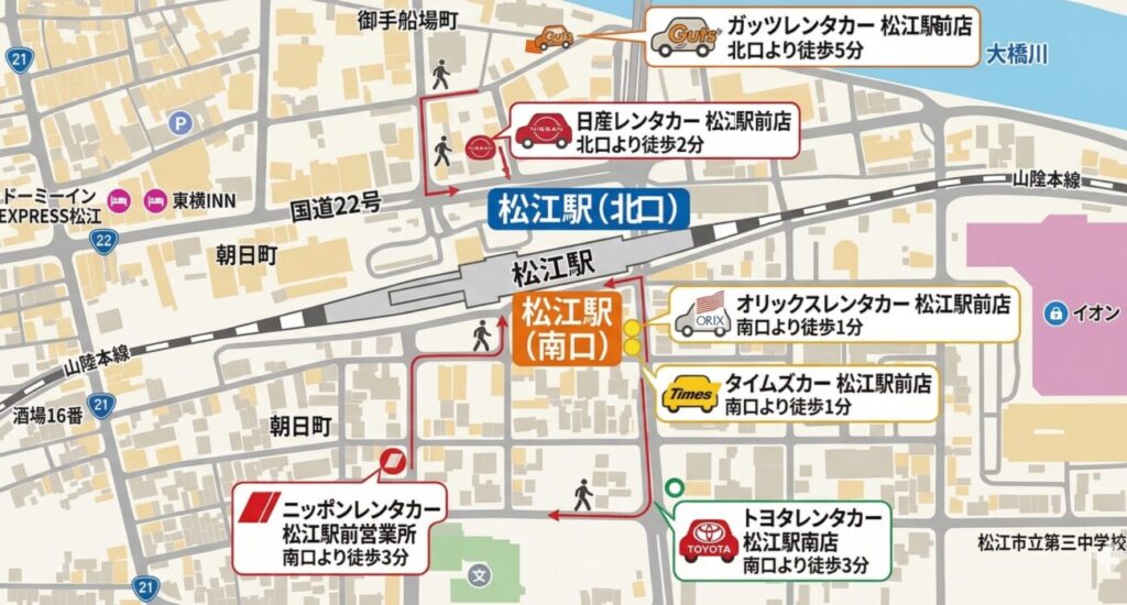 松江駅前の主要レンタカー会社を比較(駅からの距離・営業時間・乗り捨て可否)