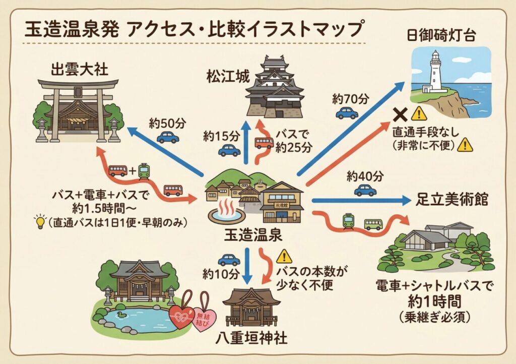 玉造温泉から主要観光スポットへの所要時間一覧