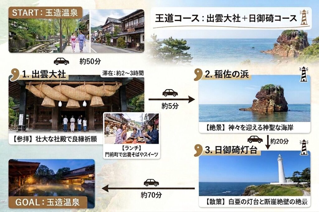 ルート:玉造温泉 →(車50分)→ 出雲大社(参拝+門前町でランチ/約2〜3時間)→(車5分)→ 稲佐の浜 →(車20分)→ 日御碕灯台(散策/約1時間)→(車70分)→ 玉造温泉