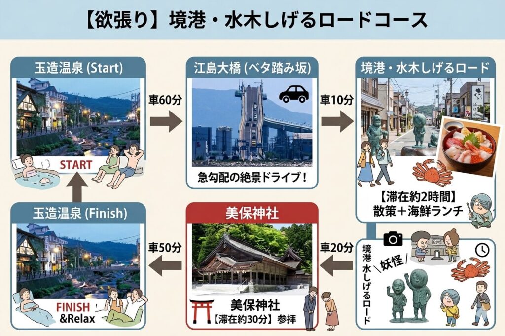 ルート:玉造温泉 →(車60分)→ 境港・水木しげるロード(散策+海鮮ランチ/約2時間)→(車10分)→ 江島大橋(ベタ踏み坂)→(車20分)→ 美保神社(参拝/約30分)→(車50分)→ 玉造温泉