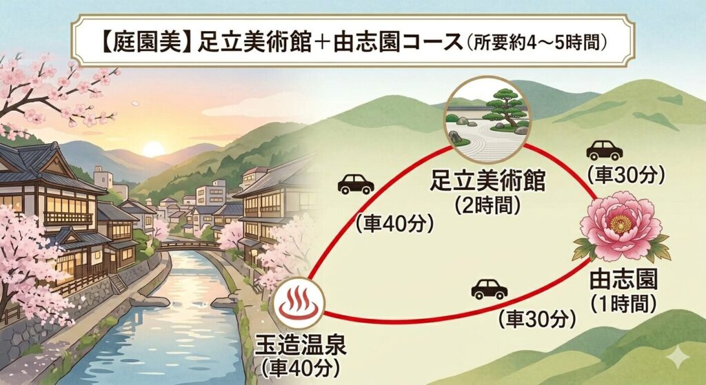 ルート:玉造温泉 →(車40分)→ 足立美術館(鑑賞/約2時間)→(車30分)→ 由志園(散策/約1時間)→(車30分)→ 玉造温泉