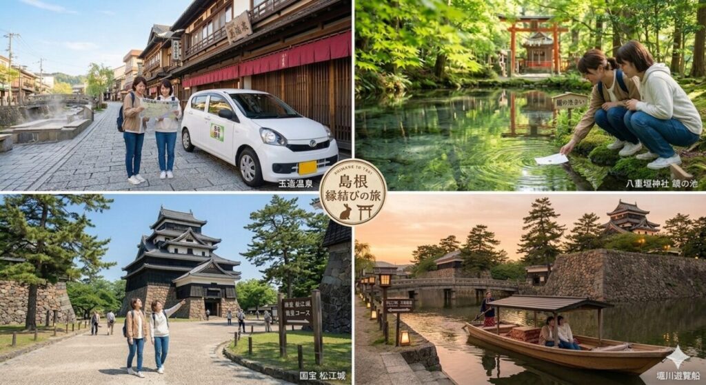 ルート:玉造温泉 →(車10分)→ 八重垣神社(鏡の池占い/約40分)→(車15分)→ 松江城+堀川遊覧船(散策/約2時間)→(車15分)→ 玉造温泉